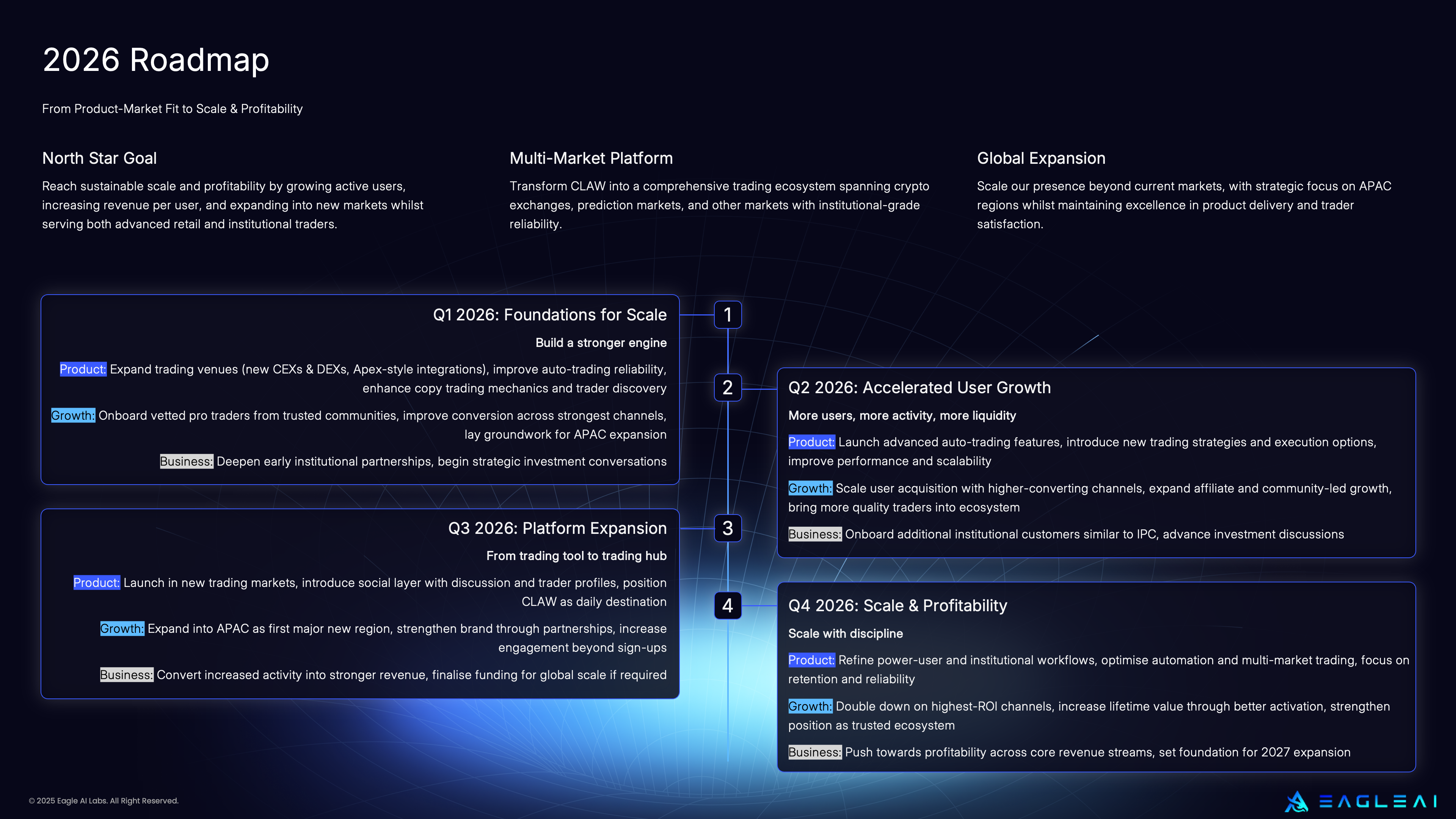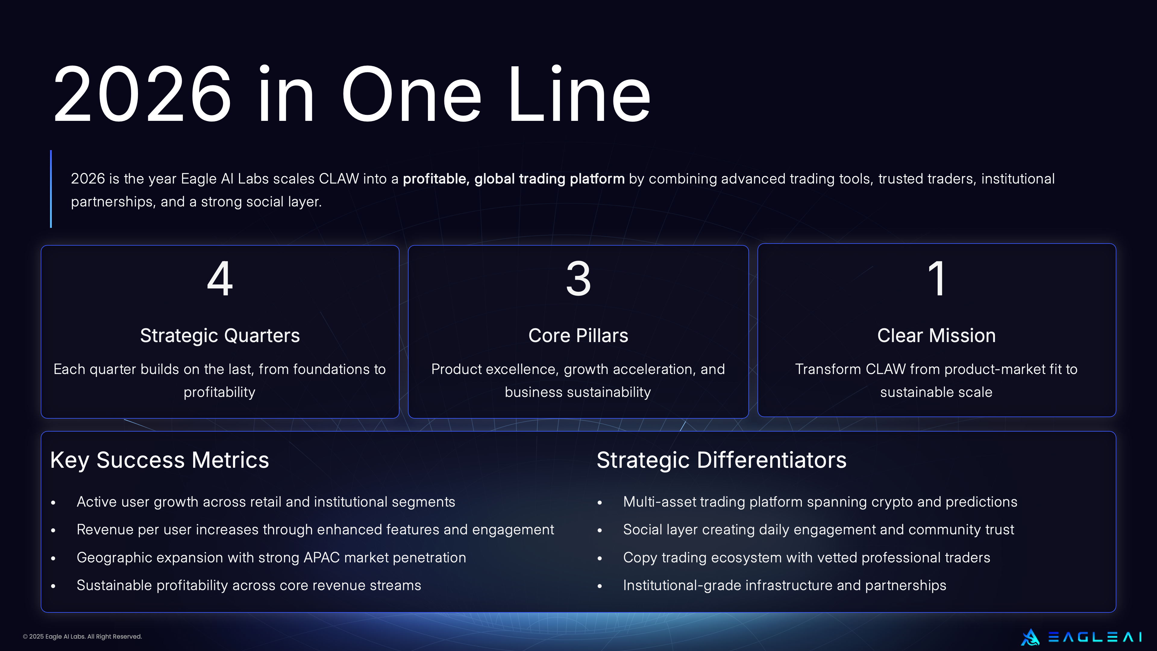 TLDR: 2026 is the year Eagle AI Labs scales CLAW into a profitable, global trading platform by combining advanced trading tools, trusted traders, institutional partnerships, and a strong social layer.